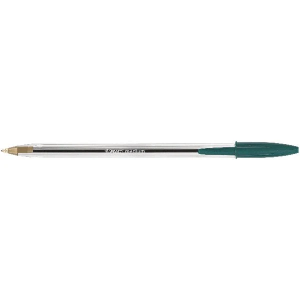 These Bic Cristal Ballpoint Pens feature a durable tungsten carbide ball mechanism and smooth oil-based ink for reliable, everyday use. The medium 1.0mm tip produces a thin 0.4mm line for elegant handwriting and detailed sketching. The hexagonal barrel includes a green cap and end plug that matches the ink for easy identification. This pack contains 50 green pens.