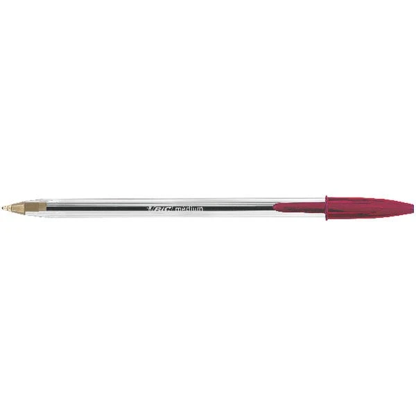 These Bic Cristal Ballpoint Pens feature a durable tungsten carbide ball mechanism and smooth oil-based ink for reliable, everyday use. The medium 1.0mm tip produces a thin 0.4mm line for elegant handwriting and detailed sketching. The hexagonal barrel includes a red cap and end plug that matches the ink for easy identification. This pack contains 50 red pens.