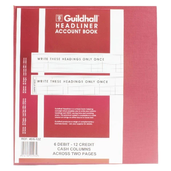 Ideal for accounts with the same headings on every page, the 80 page Exacompta Guildhall Burgundy Headliner 18 Column Account Book has cutaway pages enabling to write out your headings once and have them show through on every page. This improves clarity and prevents errors in hand written accounts as the heading need only be written out once. Made from 95gsm ledger quality paper, each page is ruled with 6 debit and 12 credit columns across opening. The book is bound in a durable vinyl burgundy cover and has a sewn binding to prevent pages being removed.