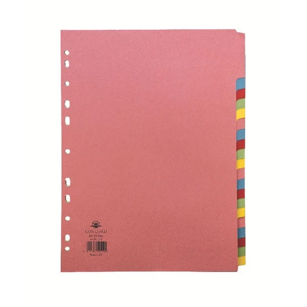 This Concord A4 20-part subject divider makes arranging and indexing your filing and presentations easier than ever. Multicoloured tabs separate documents into sections and are easily written or typed on for identification at a glance. These dividers are made of strong 160 micron board, making them the hard wearing and functional choice for students or businesses. Standard Euro punching fits almost any A4 ring binder or lever arch file.