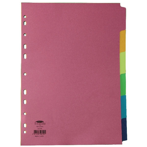 These Concord 6-Part subject dividers are ideal for arranging and indexing your presentations, projects, filing and notes with staggered tabs to separate documents into sections that are easily written or typed on for quick identification. These dividers are made of heavyweight 230 micron board making them the hard wearing and are punched to fit almost any lever arch folder or ring binder.