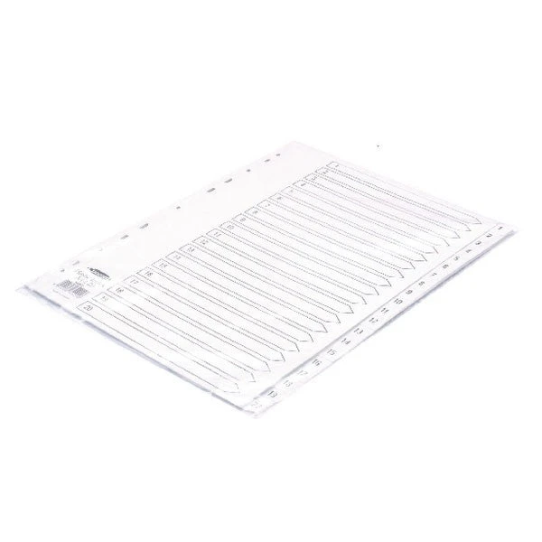 With pre-printed tabs numbered 1-20, Concord 20-Part 1-20 White Polypropylene Indexes are the practical and hard wearing choice for your ring binders and lever arch files. Made of high quality polypropylene, these indexes are tear resistant and can be wiped clean for long-lasting use. Euro punched with 11 holes and including a reinforced contents page with numbered entries, these indexes fit to a variety of A4 filing mechanisms and offer you a versatile way to organise notes, projects and documents.