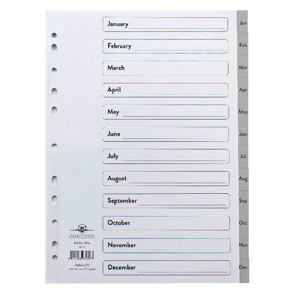 Pre-printed with the months January to December, Concord 12-Part Jan-Dec Grey Polypropylene Indexes are the practical and hard wearing choice for your ring binders and lever arch files. Made of high quality polypropylene, these indexes are tear resistant and can be wiped clean for long-lasting use. Euro punched with 11 holes and including a reinforced contents page with numbered entries, these indexes fit to a variety of A4 filing mechanisms and are ideal for organising your documents by month.
