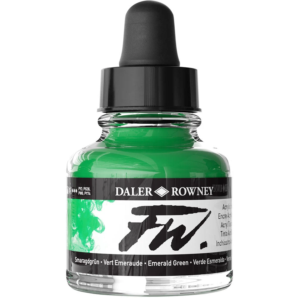 Daler-Rowney FW Acrylic Inks are acrylic based, pigmented, water-resistant artists’ inks with a high degree of lightfastness and intermixability. FW Acrylic Ink can be used straight out of the dropper, or diluted to achieve the most subtle of tones.