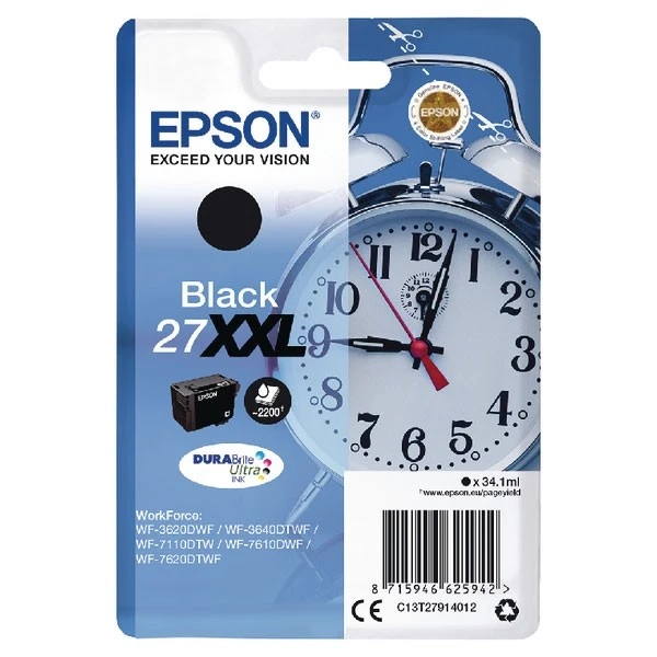 This Epson 27 XXL Black Inkjet Cartridge ensures high quality print output from your Epson WorkForce inkjet printer. As a genuine Epson consumable, it ensures consistent and reliable operation for trouble-free printing when you need it most, and is packed with 34.1ml of black ink. Epson ensures that every cartridge meets its high standards and works with your machine to provide precise, clear printing.