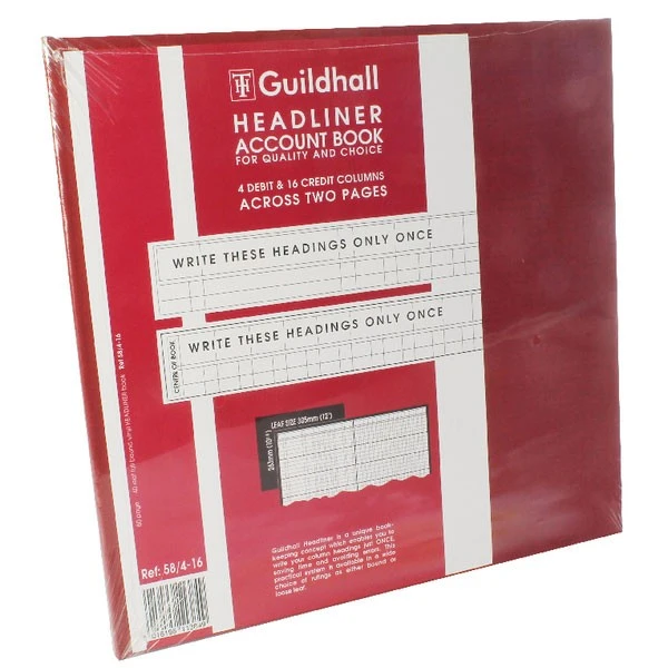 Ideal for accounts with the same headings on every page, the 80 page Exacompta Guildhall Burgundy Headliner 20 Column Account Book has cutaway pages enabling to write out your headings once and have them show through on every page. This improves clarity and prevents errors in hand written accounts as the heading need only be written out once. Made from 95gsm paper ledger quality, each page is ruled with 4 debit and 16 credit columns across opening. The book is bound in a durable vinyl burgundy cover and has a sewn binding to prevent pages being removed.