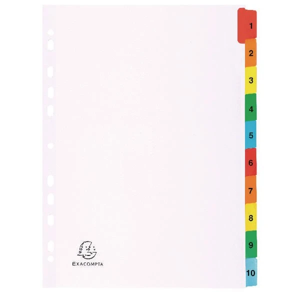 This Exacompta Guildhall A4 index is made from quality 160gsm white card with multi-coloured tabs that are numbered 1-10 for quick referencing. The index is also multi-punched for filing in standard ring binders and lever arch files.
