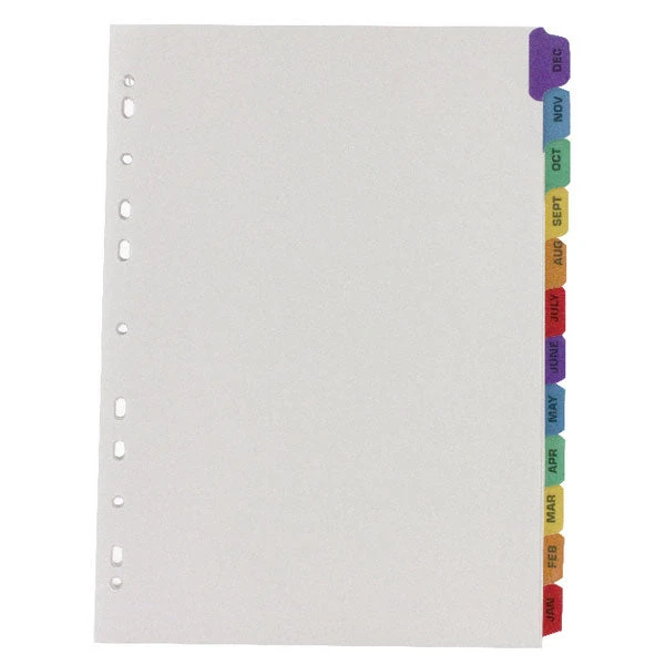 This Q-Connect January-December index divider provides a clear and simple filing solution for your everyday office needs. The front index sheet provides space for labelling to make referencing your notes quick and easy. Made from plain white card with multi-coloured Mylar tabs for extra reinforcement. This 12 part index comes with pre-printed tabs (January-December) and is multi-punched to fit standard lever arch files or ring binders.