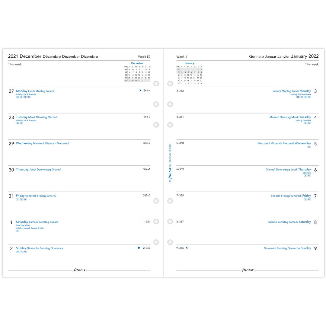 Filofax A5 Week per page 4 language 2022 Diary Refill