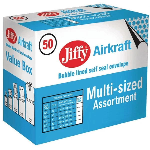 Save on postage costs with this lightweight, bubble lined Jiffy Airkraft mailer. The lining is designed to be puncture and shock resistant to protect delicate or fragile items in transit. The mailer also features a strong, simple self seal closure. This pack contains 50 gold mailers in assorted sizes, with 10 each of size 0, 1, 3, 5 and 7.