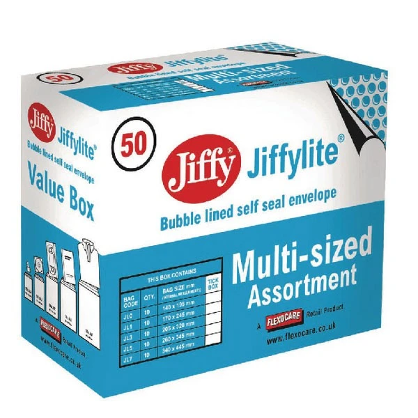 These durable, lightweight Jiffy padded bags feature tough, puncture resistant outer paper with a 100% recycled paper fibre lining. The bags have a doubled glued bottom flap and no side seams for extra protection in transit and are also 100% recyclable. This assorted pack contains 10 each of size 0, 1, 3, 5 and 7.