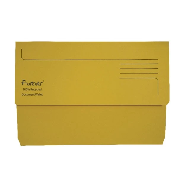 This environmentally friendly Forever document wallet is made from 100% recycled, 300gsm manilla. The folder features a 32mm gusset and can hold up to 180 sheets of A4 or foolscap paper. This pack contains 25 bright yellow foolscap document wallets, ideal for colour coordinated filing.