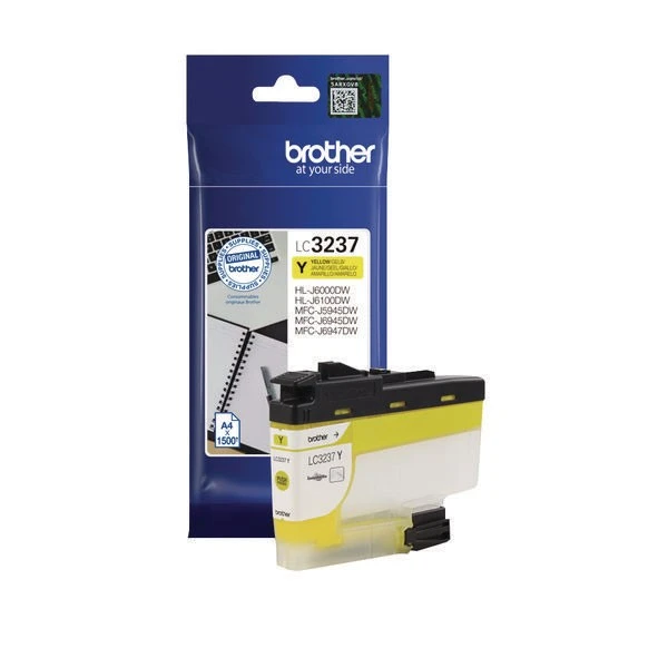 This Brother LC3237BK ink cartridge is for use in Brother MFC-J5945DW and MFC-J6945DW inkjet printers. The cartridge has a print yield of up to 1,500 pages. This pack contains 1 yellow ink cartridge.
