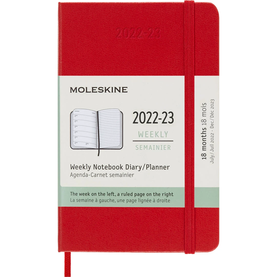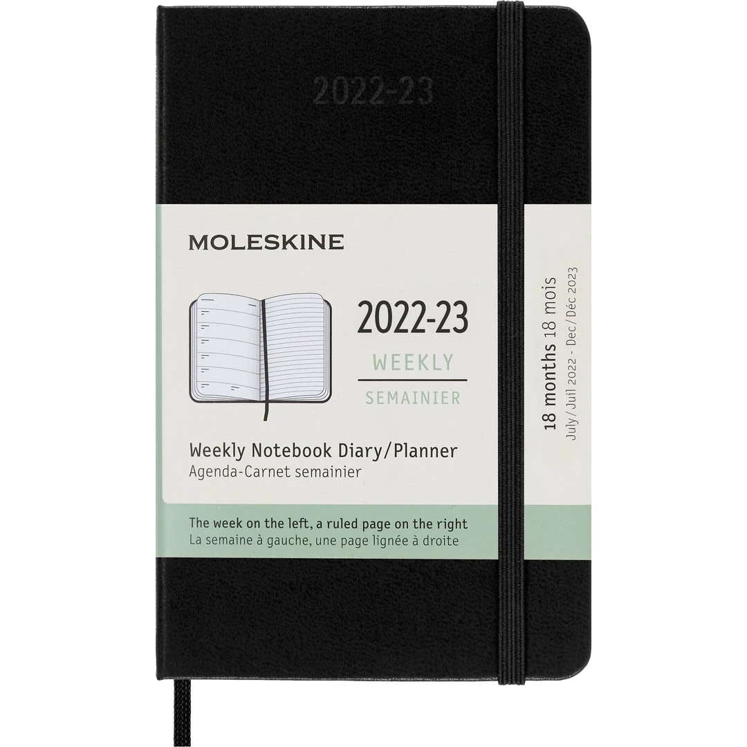 18 month diary from Moleskine. Pocket size with hard cover. Starts July 2022 and ends December 2023
