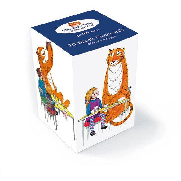 Mini Notecard Cubes featuring Tiger Who Came to Tea design by Jeudith Kerr. 20 textured artboard cards in 4 designs with envelopes. Blank inside – 70 x 100mm