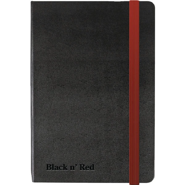 This premium Black n’ Red A6 notebook contains 144 pages of quality 90gsm Optik paper, which is ruled and numbered for neat, indexed notes. The casebound notebook features durable hard covers with a soft touch finish, as well as a red elasticated strap to help keep contents secure. The notebook also features an inside rear pocket for storage of additional loose pages and a ribbon marker for quick and easy reference. This pack contains 1 x A6 notebook.