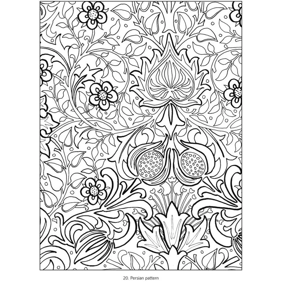 William Morris was an English artist and designer who lived from 1834 to 1896. One of his many talents was drawing wallpaper designs. You’ll find 22 of his designs in this coloring book. They are shown as small reproductions on the inside front and back covers. When you color in these designs, you might want to try to copy his colors, or you might decide to use your own. You’ll notice that for three of the designs, he used just one color, or shades of one color, plus white. Will those designs look better to you with lots of color? See what you think!