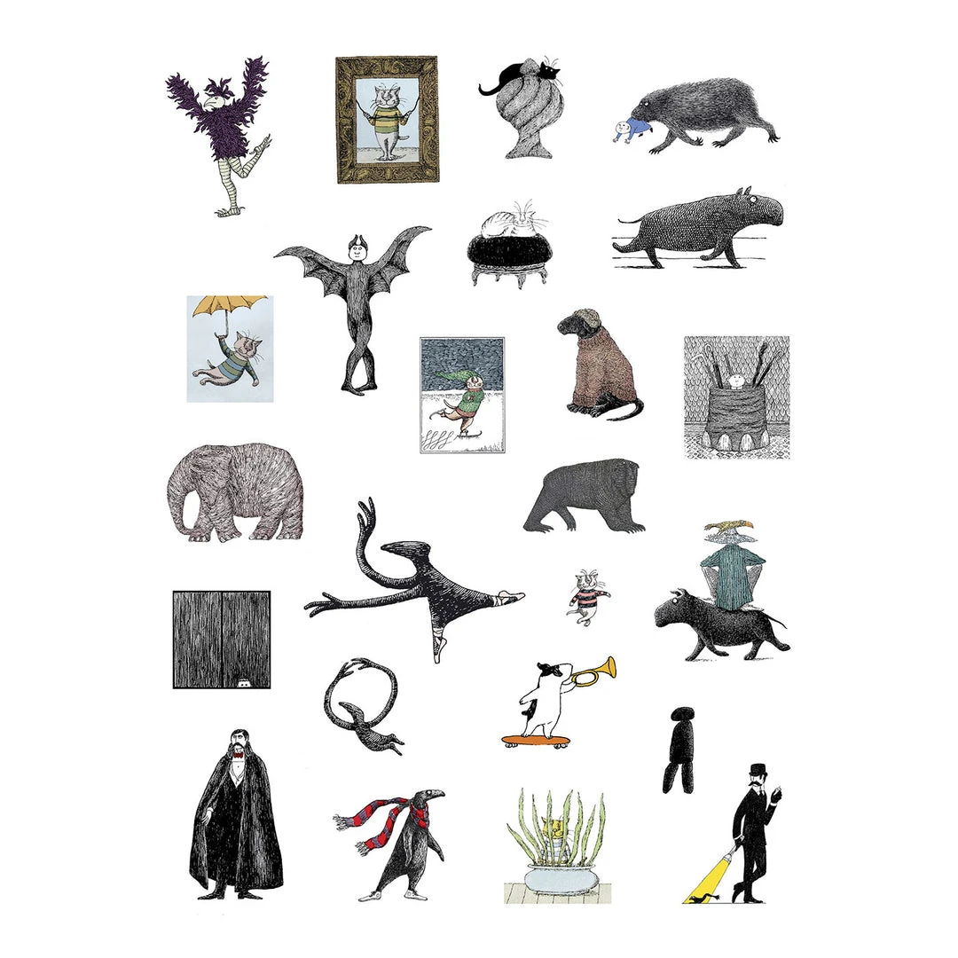 There are a few things you should know about the artist Edward Gorey, the creator of the creatures in this sticker book! Mr. Gorey (American, 1925-2000) wrote and illustrated over 100 books; he also designed stage sets and costumes, wrote plays, and created the animated introduction for a TV series calledMystery! He drew a zoo-size menagerie of fantastic beasts—some creepy, others lovable, others monstrous or just plain odd—as well as a slew of peculiar people. His characters are instantly recognizable, because he always drew them in a pen-and-ink crosshatch style.