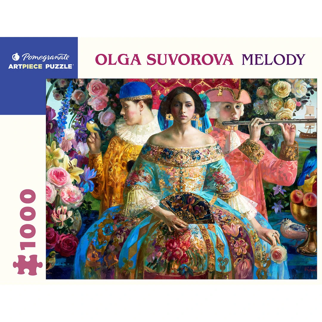 The music is playing, and the dance is about to begin. Russian artist Olga Suvorova takes us to a sixteenth-century Italian theatrical comedy in her lavish oil painting. The costumes of silk, velvet, jewels, and embroideries are the stars, rounded out with musical instruments, flowers, and birds. This 1000-piece jigsaw puzzle reproduces her ornate artwork, delicate in feeling but full of undeniably boisterous color.