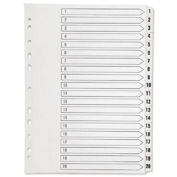 Made of durable polypropylene, this Q-Connect Index is numbered 1-20 to help you organise your filing. A front index card allows you to label your notes for quick and easy referencing. Multi-punched to fit standard A4 ring binders and lever arch files, this 20-part index is pre-printed 1-20 and comes in a pack of 1.