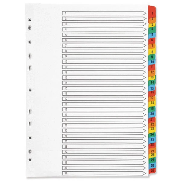 This Q-Connect 1-31 numbered index divider provides a clear and simple filing solution for your everyday office needs. The front index sheet provides space for labelling to make referencing your notes quick and easy. Made from plain white card with multi-coloured Mylar tabs for extra reinforcement. This index comes with pre-printed tabs (1-31) and is multi-punched to fit standard lever arch files or ring binders.