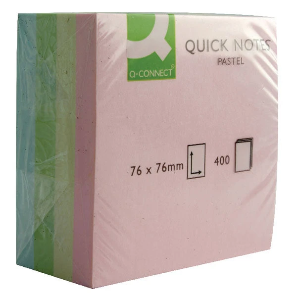 Ideal for desktop use, this Q-Connect Quick Note Cube is designed for long lasting use, with 400 sheets per cube. The strong adhesive will adhere to most surfaces and removes cleanly, which is perfect for making notes or leaving messages and reminders. This pack contains 1 note cube measuring 76 x 76mm in assorted pastel colours, including pink, yellow, green and blue.