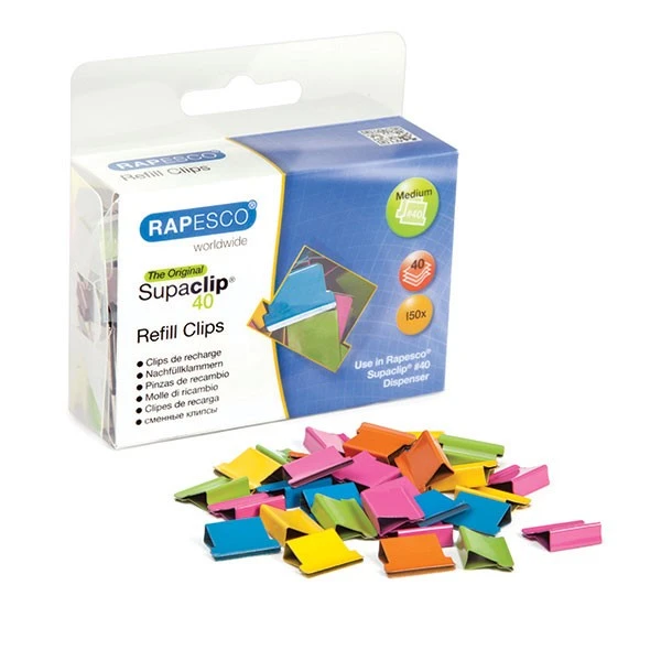 For use with the Rapesco Supaclip 40 Dispenser, these refill clips provide an easy way to fasten documents and are removable and reusable. These clips can fasten up to 40 sheets of 80gsm paper. This pack contains 150 multicoloured refill clips.
