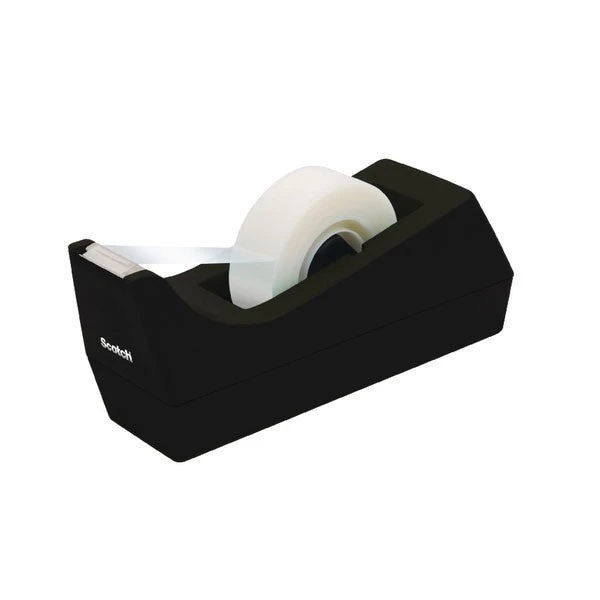 This Scotch Desktop Tape Dispenser features an impact resistant plastic construction and a non slip base for one handed dispensing. The black dispenser holds tape up to 33 metres long and 19mm wide, and has a weighted base for stability.