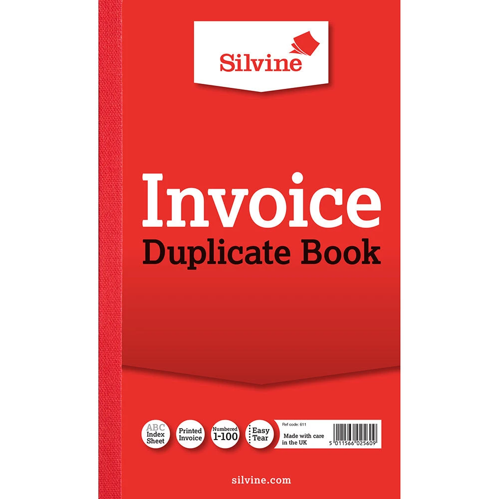 Silvine Duplicate Book. Manufactured from quality bank paper with laminated Red covers. Features include white pages numbered from 1 to 100 with an index sheet and carbon paper. Pre-printed Invoice. Size: 210x127mm (8.25x 5in). Ref: 611.