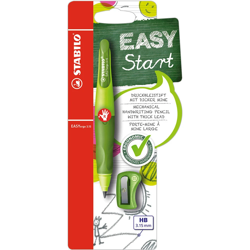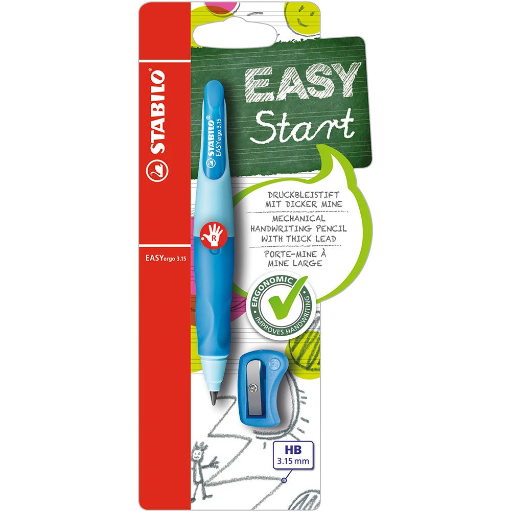 The mechanical STABILO EASYergo handwriting pencil is part of the STABILO EASY Family and has a 3.15 mm thick and break-resistant lead. This extra thick mechanical pencil has been designed specifically to help children with their handwriting from the m