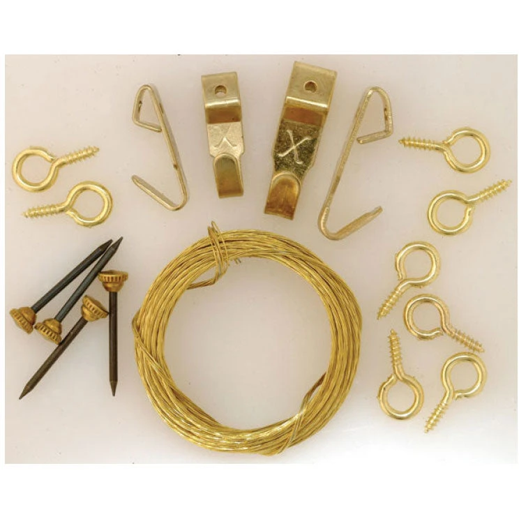 Convenient all in one pack of hooks, pins screw eyes and wire. Blister pack of 2 No 1 hooks, 2 No 2 hooks, 4 brass head pins, 8 screw eyes, 3m picture wire.